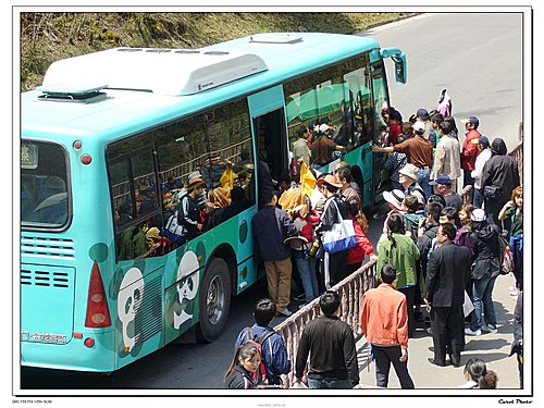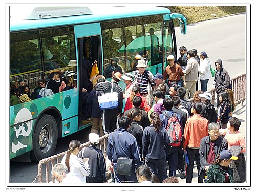 前面有提到,這次出遊選擇團的重點之ㄧ,就是九寨溝內ㄧ定要搭環保「包車」,請大家可以看一下以下圖片,這是選擇搭乘九寨溝內的環保「公車」人擠人的景象,經過我在旁邊研究的結果,我發現似乎只要不是大陸本地人,很難擠上這公車,因為外國遊客真的太斯文了,可能ㄧ開始外國遊客都照指示頂著大太陽排隊,大陸人都在樹下乘涼,等到車子到了,大陸民眾可就是ㄧ窩蜂的往前衝,把所有外國遊客狠狠的擠在後頭,所以囉!如果你自認沒有如此的狠勁,請多花點前搭乘環保包車吧!環保包車外觀等同於環保公車,好處是不用頂著大太陽排隊,不會有外人跟你搶座位,你隨身行李可以放在車上,不用提上提下的,再次提供環保包車與環保公車的票價差異: