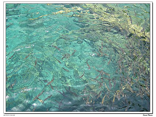 ↑五花海的彩葉大半集中在出水口附近的湖畔,一株株彩葉交織成錦,如火焰流金。含碳酸鈣質的池水,與含不同葉綠素的水生群落,在陽光作用下,幻化出繽紛色彩,一團團、一塊塊,有湛藍、有墨綠、有翠黃。