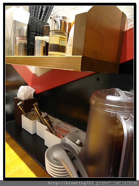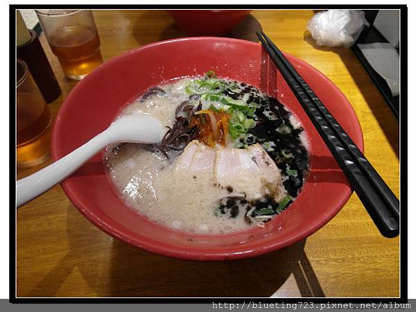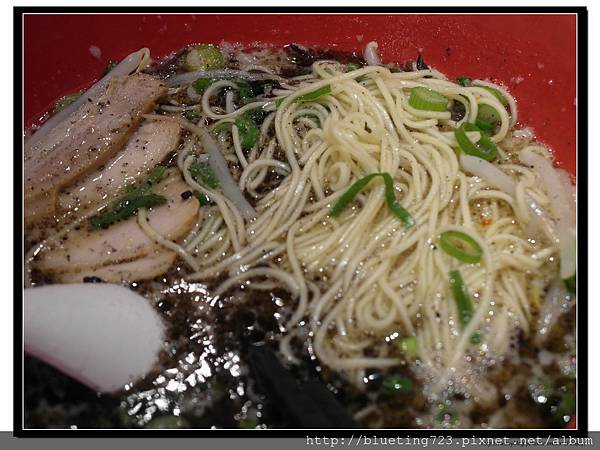 拉麵一上桌,我跟喬西就開心了,是極細拉麵,我們的最愛,外加還沒有吃就先聞到的濃郁湯頭香氣,就算沒有入口,就先大加分。沒有噱頭最最基本的豚骨湯頭,濃郁的香氣,以及入口的圓潤口感非常棒,將辣醬與黑麻油攪拌均勻的湯頭,多了麻油的香氣,雖然有些人不喜歡,但我個人覺得不錯,微辣的口味,很適合雨天。配菜雖然很單薄的只有木耳與薄薄的肉片,但因為價格合理所以能接受。用筷子夾起極細麵條,每條麵條都輕易地抓住濃稠的湯頭,入口就是一個完美。