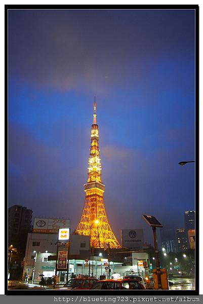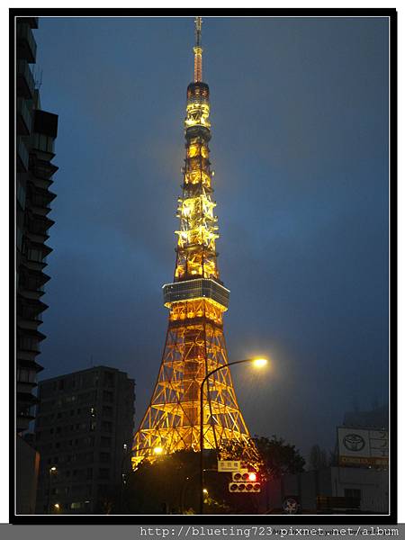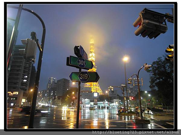 其實出車站之後就可以看到東京鐵塔,但我們還是順著路多走了兩分鐘找到比較好的視野,拍拍照,代表自己來過了,哈,沒辦法,一支摺疊傘,弱到風大一點就要開花了,旅遊要開心,性命也要顧啊!所以大家就看看風雨中的東京鐵塔照片止止渴吧!