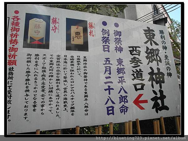 東鄉神社很特別,供奉的不是你我熟識的神明。主神是「東鄉平八郎」,是在西元1905的年日俄戰爭時,率領聯合艦隊擊敗了俄國波羅的海艦隊,成為近代海權爭奪中,東方黃種人打敗西方白種人的先例,因此被奉為「軍神」,也是勝利の神,因此東鄉神社成為祈求勝利的神社,神社內販售單個「勝」字的御守,可是依據東鄉將軍親筆之跡,然後印在御守上的。