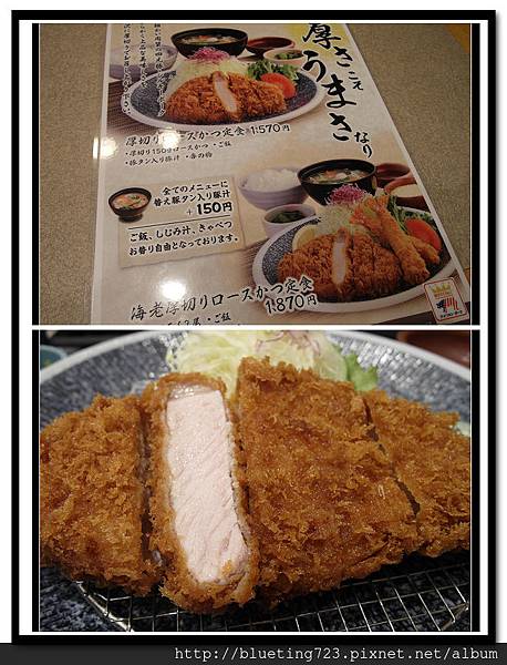 菜單上的每一張照片都很吸引人目光,光用看的就能夠分泌唾液,這也是日本人的強項,光用照片與假模型就激起大家點餐的衝動。不過,和幸豬排的餐點也不是太便宜,選用美國豬肉的套餐大概落在兩千上下,選用日本國產豬則要三千日幣起跳。反而,和幸豬排是我跟喬西在日本旅遊中吃最貴的一餐,我們都點了里肌肉炸豬排套餐(1570円)。套餐附有白飯、高麗菜絲、味噌湯、醃漬小菜,有需要都可以續碗。