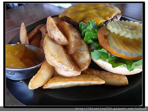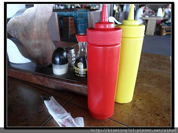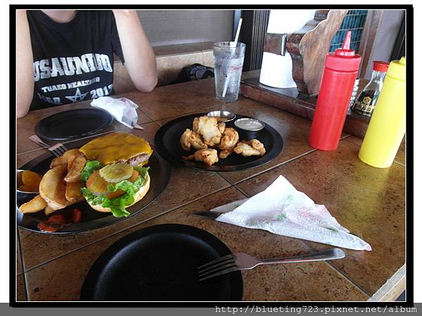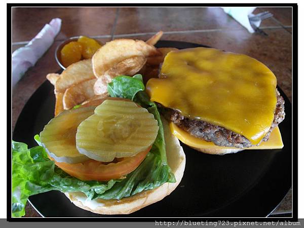 在美國屬地,千萬不要用台灣的漢堡SIZE作為參考值,美版的漢堡通常是台灣的兩倍。這次的漢堡,個頭也不小,上桌的時候是上下半部分開展示。當然吃的時候要將它合體,只是高度太高,用餐前下巴關節要先鬆好,免得一張開大嘴試圖一口漢堡的下場會是下巴脫臼,美國醫療費用很高的,哈!