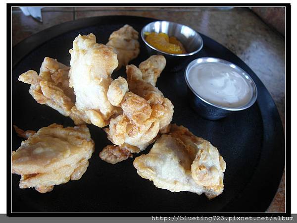 炸雞塊先上桌,搭配美乃滋醬,感覺像是日式雞塊。皮酥裡嫩,美乃滋醬也好吃,就連配菜小柑橘都可口。