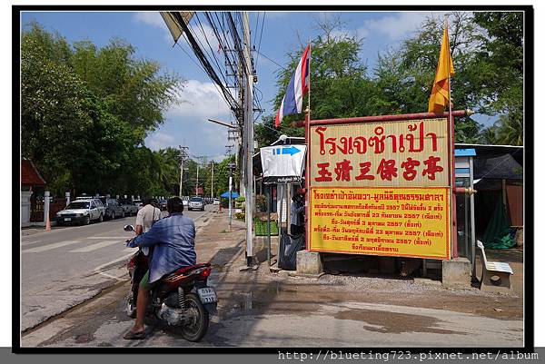 總之,我們就在車上叔叔阿姨們歡樂的台灣話題中放空了,直到看到路邊出現玉清三保宮亭的指示牌後,開始注意自己何時要下車,可能表情有點慌張,一個大叔突然問我:Amphawa?我回:柴~(泰文:是) 沒多久車就停了,大叔對我招招手要我一起下車,我還在猶豫的時候,他比了比前方說:Amphawa~。上圖就是雙條車停車的地方。當下,我跟弟弟對看一眼,考慮著要不要跟大叔一起下車,結果大叔下車後站在車尾持續對我們招招手,外加表情超和善,看了眼其他乘客,大家默默的點點頭。反正剛剛已經看到玉清三保宮亭的招牌,距離應該不遠,外加弟弟相陪,就算被騙也不能對我怎樣(如果是一個女孩的旅行請多加注意),所以鼓起勇氣跟大叔一起下車,大叔還怕我們不知道怎麼付錢,帶我們走到司機的座位繳錢,又再跟司機說了一串泰文,有聽到Amphawa,就看到司機冷靜的點點頭,應該是我們的眼神反射出不相信的目光吧!所以大叔請司機掛保證他沒有帶錯位置,既然連司機都點頭了,還有什麼好怕。上圖就是下車點。