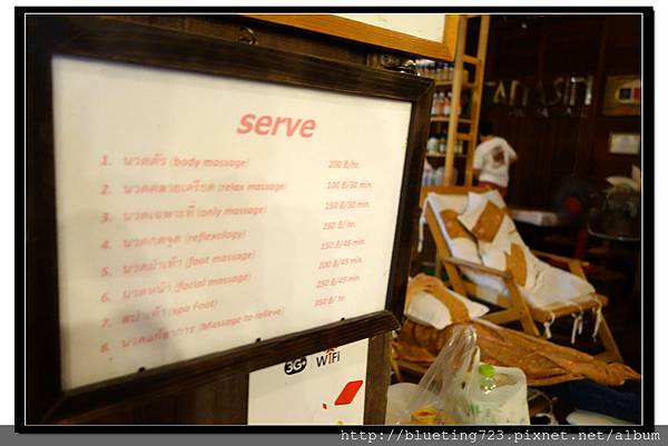 安帕瓦的腳底按摩店,下午五點前通常不用排隊,有時只有小貓兩三隻,五點後幾乎是滿場,有時遇到團客包場,甚至要等半小時以上。我大概五點半到,接待的人說要等20分鐘,費用很便宜,45分鐘的腳底按摩150泰銖,其他還有身體與臉部按摩可選擇,大多數的人都是選腳底按摩。