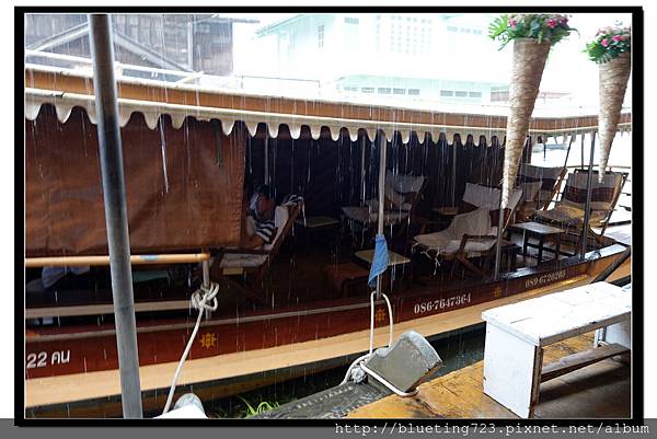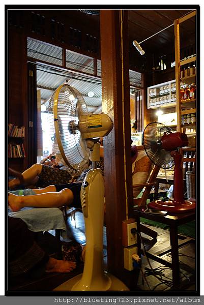 等待約5分鐘,服務人員走過來問我願不願意上按摩船,你沒看錯,就是上船,這邊按摩院生意好到空間不夠,又不到改建房屋,所以直接改造一艘船電動長尾船,在床上放置舒適的座椅,一艘船大概有八個座位。因為不想等,所以答應上船,沒想到在船上按10分鐘後,店內有空位,又被請下船,在那短短的10分鐘,船夫將船開到河道上,還來個大迴轉,一邊按摩一邊享受微風輕拂,雖然舒服,但缺點是會成為遊客拍照的重點,凡經過的遊客都會駐足拍照,我後來直接拿毛巾蓋住臉,太害羞了。不過按摩船似乎是給VIP搭的,因為我跟弟弟被請下船後,接著來一組泰國家庭團,老闆娘馬上熱情招呼,感覺是熟客,之後那一整家人就被請到船上去,船夫也把船開出去繞一圈(例行公事!?),之後停泊在店門口,有拉下遮雨棚,遮雨順便保有隱私。我們在按摩的時候遇到瞬間大雨,擔心晚上螢火蟲遊船行程,沒想到雨下一小時左右就停了,超幸運。