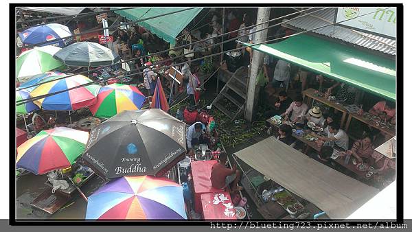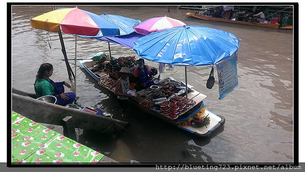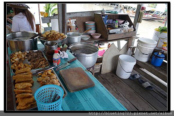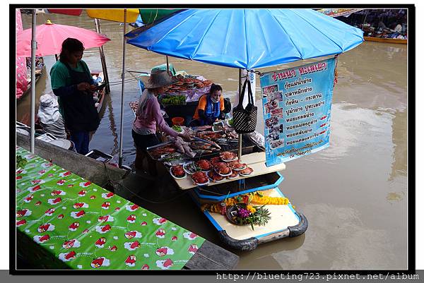 在水上市場閒晃一陣,12點開始海鮮店的客人越來越多,每間店的入座率80%,多數是泰國當地人,深怕晚上遊客會更多,等待時間會更長,我跟弟弟決定在中午先吃海鮮。整個水上市場的海鮮攤非常多,有河岸上兩側的餐廳,也有河道上停泊的餐船,不過餐船用餐位置是在河道兩側木板釘出的窄小餐桌,座位數不多,一艘船頂多分配10個座位,看起來美味的餐船都需要等候入座。
