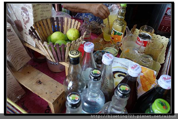 走回民宿小憩的路上,發現民宿前有涼拌青木瓜餐車,附近的住戶都出來買,我們當然也要捧場。比了比別人的涼拌青木瓜,說:能~(泰文:1),對方馬上意會,餐車是由兩位婦女經營的,一個負責刨絲,一個負責涼拌,刨絲阿姨想跟我閒聊,開始用泰文問我問題,涼拌阿姨馬上嚴肅的制止她,應該是看出我們是外國人,但刨絲阿姨不死心,爭論了一番,又問了我一長串泰文,我只好笑笑地喊出我的救命單字:坤呆丸(台灣人),涼拌阿姨馬上一副你看吧的眼神,刨絲阿姨就安靜了,哈哈哈哈哈!最後我們之間的對話只有涼拌阿姨拿起辣椒說:OK?我回答:OK。拿起袋子晃一晃,我猜意思是問我要裝袋嗎?我比了比民宿又比了比保麗龍盤,阿姨就知道我不用袋子,最後我問:掏ㄌㄨㄟˊ?(多少錢)她答:李喜哈霸(25泰銖)。結束,輕鬆寫意得到平民小吃一盤。