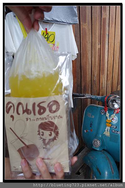 用餐的同時,對面小販送來一紙袋給用餐的情侶,看他們拿出紙袋內的吸管戳洞,原來紙袋內是塑膠袋裝的飲料,這包裝我有印象在網路看過,據說是現在很流行的泰國飲料,類似台灣的手搖杯。