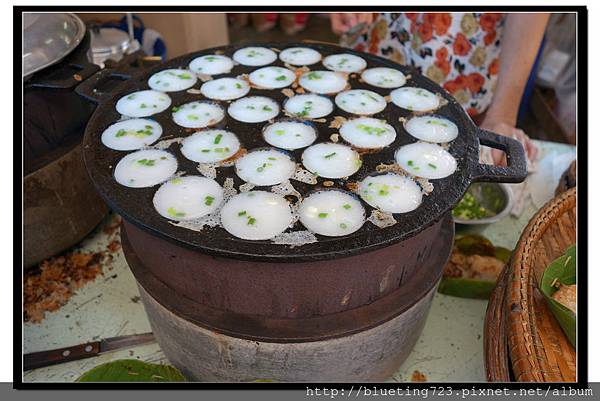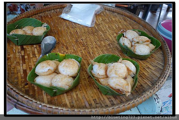 五廟遊船回到水上市場,我們買了椰奶煎(我自己取的名字),20泰銖。這是用類似雞蛋糕的鐵盤煎出來的小吃,味道是濃縮的椰奶甜糕,口感類似客家水粄,個人很愛,弟弟覺得太甜。