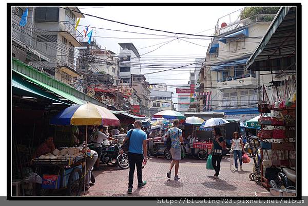 下車地點是金佛寺的外圍,周圍有許多小攤販,多是販賣佛像佛牌等宗教相關的商品,據說價位偏高。當天還遇到印度旅遊團,男士們都是金錶金項鍊,女士們都是金戒指金手環,完全彰顯新興市場的消費力。據說外圍有不少手持相機的人,與在安帕瓦五廟遊船遇到的一樣,會幫你拍照後將照片印在胸章上,兜售價格是200泰銖,有經驗的人說可以議價到50泰銖,不過我這次沒有遇到,可能因為我們是散客,旅行團的生意比較大筆。