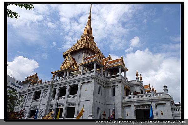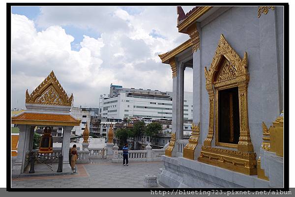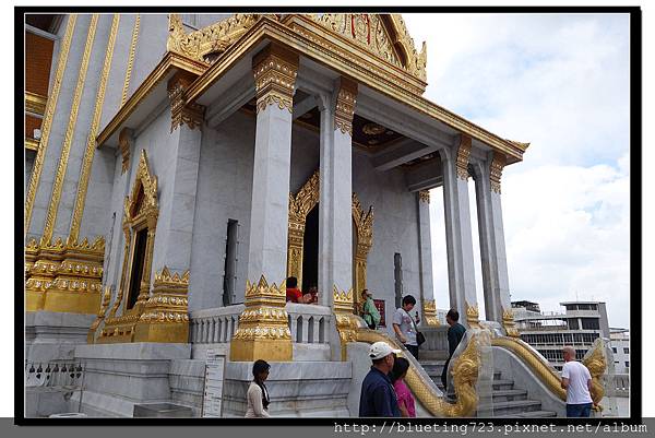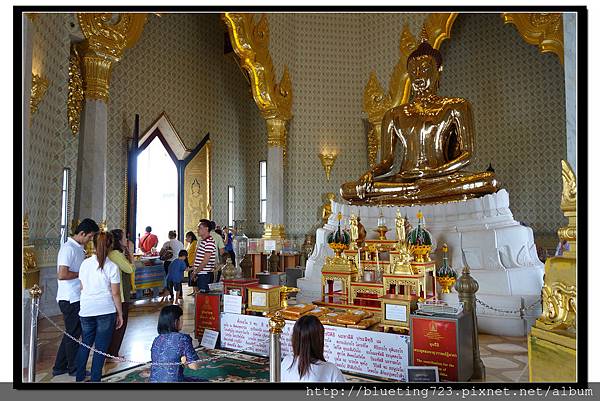 拾階而上,進入金佛寺之前需脫鞋,門外有鞋架供信眾放置鞋子,赤腳踩在大理石地板上,腳底的冰涼感直竄心頭,炎熱的天氣,赤腳參觀很舒適。佛寺雖不像大皇宮硬性規定服裝儀容,但既然是來禮佛參拜,也請大家多多注意服裝禮儀,至少我在泰國很少看到當地人短褲低胸到廟裡,歐美觀光客反而比較多。