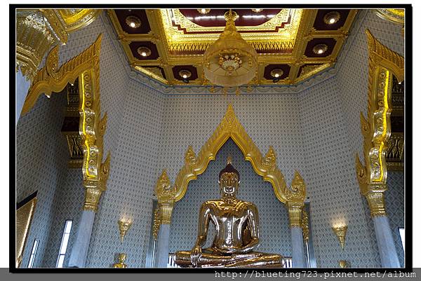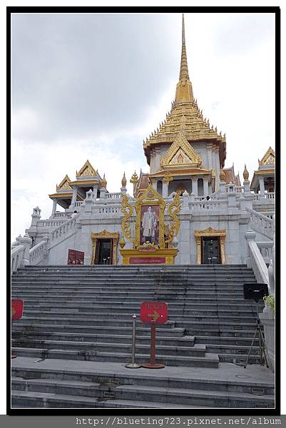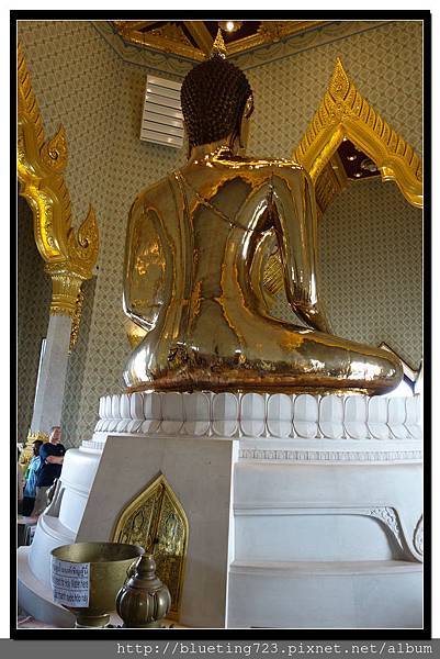 金佛寺,又稱黃金佛寺,由三位華人出資所建,又稱三華寺或三友寺。金佛寺內因供奉一尊世界上最大的金佛而聞名,與玉佛寺的玉佛、臥佛寺的臥佛同為泰國三大國寶,非常具有重要的歷史及藝術價值。整座金佛寺總共有四層樓,白色大理石的基座與具有中式建築風格的外觀,外加金燦燦泰式風格的尖塔式屋頂。一樓是行政區域,二樓與三樓是博物館,四樓則是金佛殿。二三樓大佛紀念館與中國城博物館,門票共100泰銖,四樓金佛殿,門票40泰銖,只有博物館有驗票人員,金佛殿則是自由心證,不少人其實根本沒有買門票就進入。我們只打算去金佛殿,網路上不少遊客看準沒有人驗票,所以不買票進入,我跟弟弟則抱持著添香油錢的心態乖乖買票。