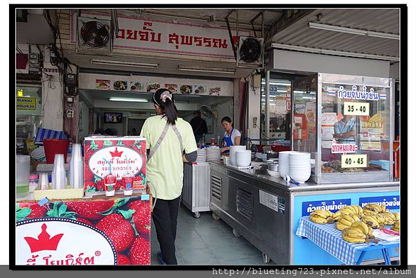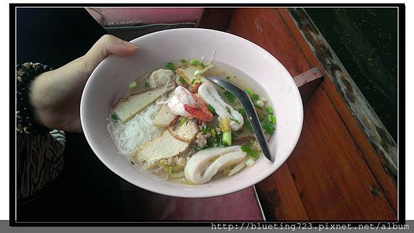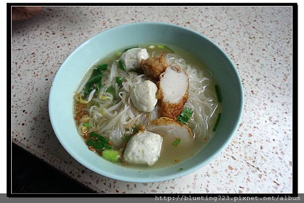 泰式米粉湯 (25-50泰銖不等),幾乎成為台灣觀光客到泰國必吃的小吃之一,連旅行團排水上市場的行程都會刻意將米粉湯列入特色項目。其實,所謂的泰式米粉湯,就是台灣的湯麵,也可以改成河粉湯、白麵湯、油麵湯、泡麵湯等不同類型,是曼谷街頭常見的小吃。最簡單的湯麵配料就是兩顆丸子或兩片水煮肉片,但店家也提供其他選擇,有叉燒肉、餛飩、各種丸子等配料,跟台灣湯麵一樣,也有豆芽菜等些許蔬菜點綴。再者,也可以選擇不同的湯頭,在曼谷看到的有清湯(高湯)、紅湯(有點甜麵醬的甜味)、黑湯(醬油口味)、酸辣湯(冬蔭功口味)。我幾乎都是依靠小吃攤的圖片決定吃什麼,不然就是指一下其他桌客人桌上的食物,正確率幾乎95%以上,不一樣的5%通常是老闆自己加料,例如點清湯麵多幾顆丸子,然後價錢就比別人多5元~XD