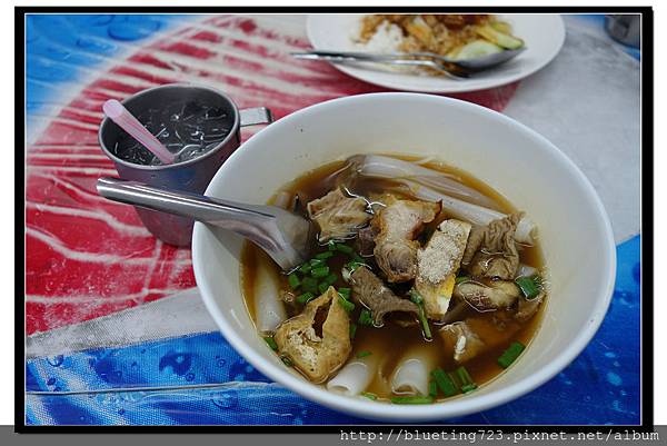 豬雜粿條湯(25泰銖),筆管狀的粿片味道普通,帶有淡淡的米漿味,有種古早味,配料是豬肉片、豬雜、油豆腐、水煮蛋等,湯頭帶著淡淡的滷汁味,豬雜處理得很好,軟嫩沒腥味,一口湯頭搭配粿仔跟豬雜,在熱騰騰的狀態稀哩呼嚕下肚,美味極了!