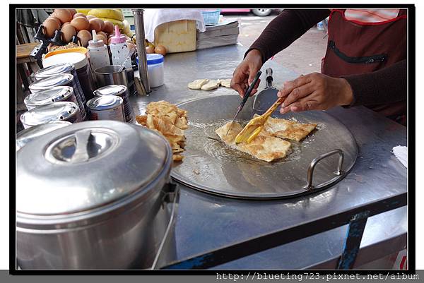 煎餅 (20-60泰銖),很多朋友推薦的香蕉煎餅,我以為在曼谷隨處可見,沒想到一整個禮拜的旅遊期間,只在中國城的碼頭附近找到,所以,各位朋友到泰國旅遊,看到煎餅攤請不要錯過,可遇不可求。從基本款的煉乳煎餅,到高級款的巧克力香蕉煎餅都有,請自行選擇。第一次嘗試,點了香蕉煎餅。老闆先將揉好的麵糰仔細地用擀麵棍攤開,挖起一大坨奶油於煎鍋中化開,稍稍將麵皮煎定型後,加顆打散的雞蛋,再將香蕉切出薄片鋪於麵皮上,均勻撒上砂糖,等砂糖融於麵皮上,將麵皮翻折成四方形,雙面煎到微焦程度起鍋,淋上滿滿的煉乳。瞧瞧這外觀,根本是要逼死所有想減肥的女孩。