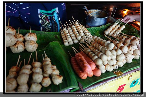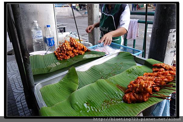 烤肉串(一串5-10泰銖)。泰國人的烤肉似乎是說好似的口味都很相近,難不成泰國也有自己的獨家金蘭烤肉醬!?至少我在泰國一周內幾乎天天吃烤物,甜甜鹹鹹的好滋味,完全沒有碰過地雷,竹籤上除了肉串,還有各式各樣的丸子熱狗等選擇,重點,現在許多泰國路邊攤都還是炭火燒烤,略帶淡淡炭烤香氣的肉串,加上油亮油亮的色澤,讓人食慾大開。即便是不太餓的時候,經過烤肉攤都難敵便宜的價格與烤肉香氣而買上一兩串解饞。肚子餓的朋友也可以多花5-10泰銖買包糯米飯搭配,看到不少當地人就是一包飯兩串肉解決一餐。