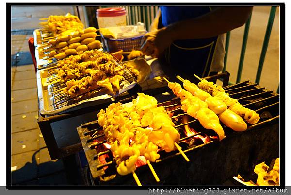烤花枝(20-40泰銖),這攤位可遇不可求,也是在Santiphap Park和平公園門口的攤車,只有在星期五、六看到,旅遊期間沒有在其他地方看到過。整隻大花枝(全身)40泰銖、花枝頭一串25泰銖、花枝肉一串20泰銖、花枝蛋一串30泰銖,這攤是我跟弟弟票選烤物第一名的攤車,還造訪兩次。當初是被花枝蛋給吸引,在網路看過介紹,在台灣沒吃過,沒想到一吃上癮。師傅的手藝很好,小小的烤台,每一串花枝都顧的很完美,也會細心的拿剪刀剪掉花枝頭微微燒焦的地方。