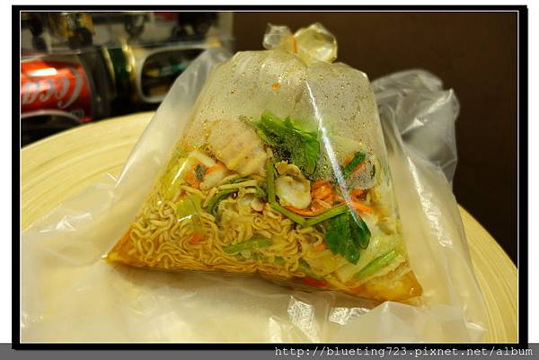 只見店員手法迅速,先將生海鮮料(鮮蝦、花枝等)丟入滾水中煮,另外再將MAMA泡麵燙過,青木瓜絲、辣椒、蝦米、花生米、洋蔥、小番茄、小螃蟹等一堆配料則丟入缽裡搗一搗,最後將所有食材大集合,加入調味料拌均勻。一大包賣60泰銖,但是超級好吃,後悔在最後一天才來買。