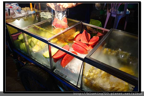 水果(一串10-20泰銖),誇獎一下泰國水果的便宜,台灣常吃到的西瓜、鳳梨、木瓜、芒果,還有台灣比較少吃到的榴槤、山竹、波羅蜜、龍貢都非常實惠,如果遇到產季,根本就是銅板價一大袋。甜度不一定比台灣甜,台灣的農改技術世界有名,所以台灣水果的甜度也是一級棒。泰國攤販多數是將水果削好,用竹籤串起,一片西瓜、哈密瓜、鳳梨都是10泰銖的便宜價格起跳,如果不想拿一串啃,也可以請老闆切片裝袋。泰國人習慣吃水果沾粉,粉料是用糖、鹽、辣椒混和,也有梅粉、糖、鹽的組合,如果遇到比較不甜的水果,例如鳳梨、柚子等,沾粉吃真的會增加甜。