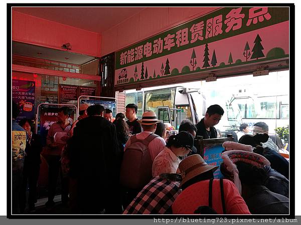 統一集合地點是「大理古城南門遊客中心」,導遊會在出發前一晚通知具體上車時間與地點。透過客棧報名,會提供去程接人的服務,回程自理。客棧老闆娘收到通知是8:30出發,8:00到客棧路口接人,時間還算充裕,一早能先吃完早餐再出發。來接人的是該旅遊集團的小台電瓶車,一車大概可以載到12人,上車前,車上已經坐著其他客棧同樣要到南門遊客中心的旅客,但不一定是同團。