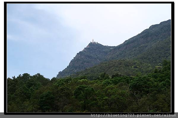 用餐後,回到祝聖寺與其他到香會街用餐的人會合,再步行到「玉龍瀑布」。玉龍瀑布是雞足山的一大自然景觀,名列雞足山八景之一。從祝聖寺步行約500公尺可達觀瀑亭,現在的觀瀑亭是1990年重建的,可以遠眺對面山崖的瀑布。玉龍瀑布是一個斷崖瀑布,落差有60多公尺,從雞足山天柱峰下密林中彙聚而來的溪水,在斷崖上猛然跌落,形成了「白練永懸」的美景,同時在谷底發出水石相擊的迴響。But……一切都是那個But,我們去的時間不對,是枯水期,而且連著幾天都沒有下雨,看到的水量完全稱不上瀑布,說是山間小水流還差不多,不過觀瀑亭眺望山谷景致還是不錯的,還是推薦前往。下圖左下角隱約可以看到細細的水流,就是瀑布了。好險在觀瀑亭還能遠眺金鼎,有多遠眺,下圖中,遠方小小小的白塔就是「棱嚴塔」。