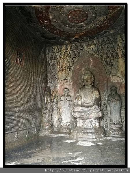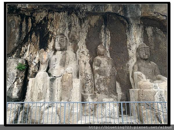北門進入後,需要先沿著伊水走上一段路才會看到石窟。途中遇到「禹王池」,原以為會是個很大的池塘,沒想到是個小水池,很容易就錯過。繼續走,率先看到的是賓陽三洞,賓陽洞有三窟,賓陽中洞是北魏時期(西元386~512年)的代表性作品。這個洞窟前後用了24年才建成,是開鑿時間最長的一個洞窟。洞內有11尊大佛像。洞窟正壁刻主像釋迦牟尼,左右二邊有弟子、菩薩侍立,佛和菩薩面相清瘦,目大頸平,衣錦紋理周密刻劃,有明顯西域藝術痕跡。窟頂雕有飛天,挺健飄逸。據說,洞口兩壁上還有一幅浮雕「帝后禮佛圖」,造型別致,構圖美妙,後被盜鑿,現置於美國紐約博物館。而洞口唐宰相書法家褚遂良書碑銘,很值得一覽。