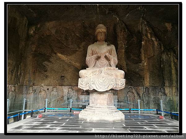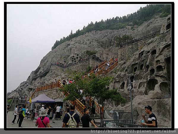 參觀此寺,需要先登上一百多階台階。爸爸走到這,其實有些疲憊,應該說累積多天的步行,對老人家來說還是頗為吃力,而龍門石窟的特色又是依山壁而鑿,要仔細參觀就需要上上下下的走階梯。因為奉先寺是龍門石窟的參觀重點,所以勸說爸爸至少看完奉先寺,之後所有洞窟都可以放棄,哈!爸爸最終努力向上走,看完盧舍那大佛後,就心滿意足了,後面所有需要往上爬階梯的石窟,爸爸一律從下仰望,以表尊敬,哈哈哈!看不到的,就PASS,不強求。其實爸爸還是能走,只是爬階梯時膝蓋會不舒服,不想勉強爸爸過度費力,我們後面還有三天行程啊!