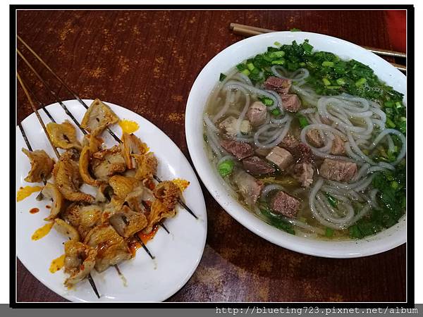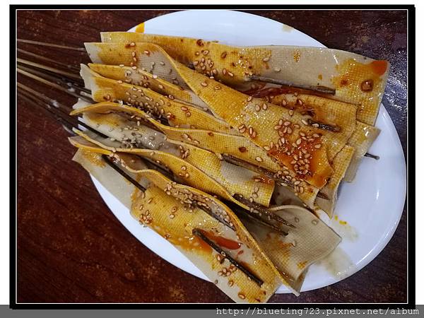 從偃師回到洛陽,時間是下午四點左右,因為午餐隨便吃,肚子餓了。請劉師傅推薦小區附近好吃的麵食,劉師傅推薦這一間「道北曹家米線」,說是他吃過附近味道還可以的店家,其他好吃的店太遠了 ( 吃完我們要自己走回客棧 ) 。道北曹家米線是一間連鎖店,洛陽市內有不少分店,我們去的是高鐵店,在厚載門大街與伊洛路交叉口西北。還不是晚間用餐時間,店內沒有客人,點了 4 碗 15 元的牛肉米線,菜單上的涮豆皮 ( 一串 0.5 元 ) 與涮牛肚 ( 一串 2 元 ) 非常吸引人,豪邁的加點了 10 串豆皮 5 串牛肚。