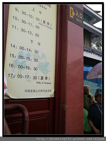 打算看上午場的少林武術表演,所以沒有搭乘景區電瓶車。武術館位在遊客服務中心通往少林寺的電瓶車路徑中段,電瓶車沒有設站不能停靠,如果搭到少林寺,也是要往回走到武術館。我們抵達武術館時是十點左右,下一場表演是 10:30 ,表演前 10 分鐘開放入場,所以只要排 20 分鐘,因為當時進場門口已經有五六位民眾在排隊,我們就跟著排。不誇張,不到五分鐘的時間,有大隊人馬的團客被導遊帶來排隊,後方瞬間多了至少三四十人,大家撐傘或是穿雨衣排隊,到了 10:15 ,排隊人龍更是將入口前的廣場塞得寸步難行。