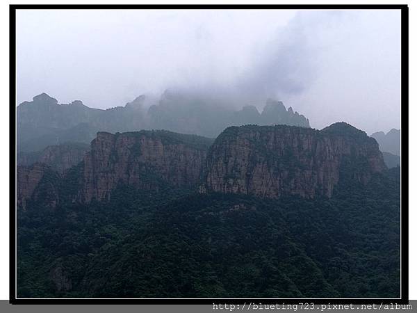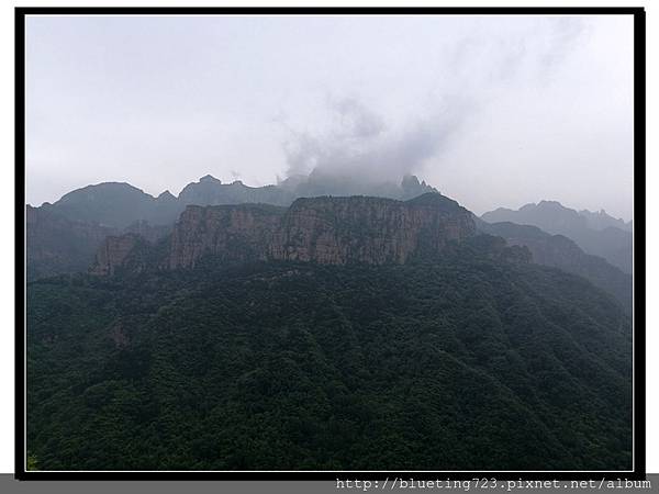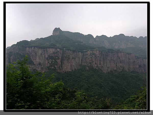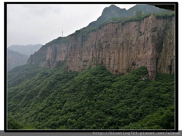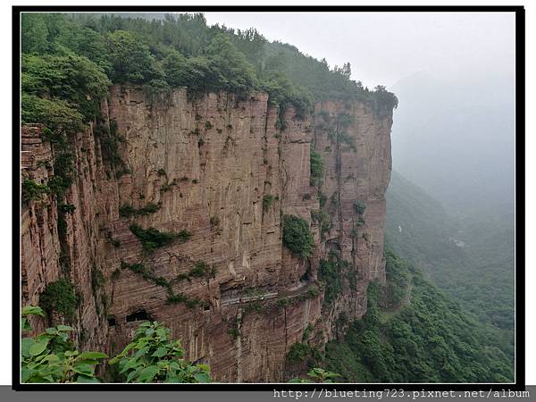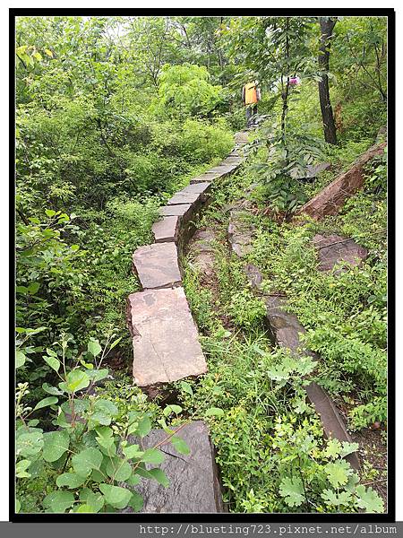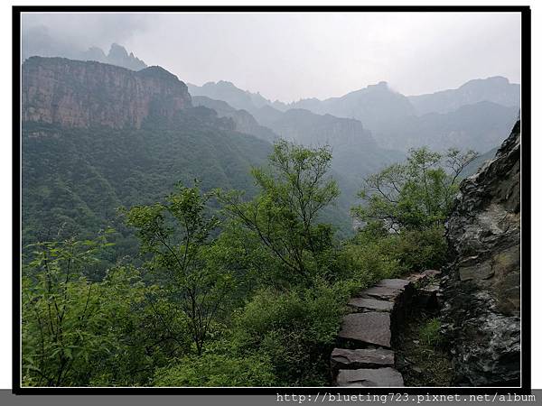 住宿的「萬仙山天梯山庄」老闆,指引一條附近的小路,說走一小段就能到絕壁長廊。爸媽、伯父伯母、我、劉師傅,一行六人就這樣進入了小路。走著走著,從兩旁樹林的泥土小徑,到絕壁上的石塊小路!?但要說是由石塊鋪起的小路,也有點牽強,比較像是石塊搭起的防水牆防土牆的上方。石塊不大,一開始還有兩排石塊可供雙向通行,越後面,就是僅能一人通行的寬度,如果對向有人來,要互閃也有點危險的程度。