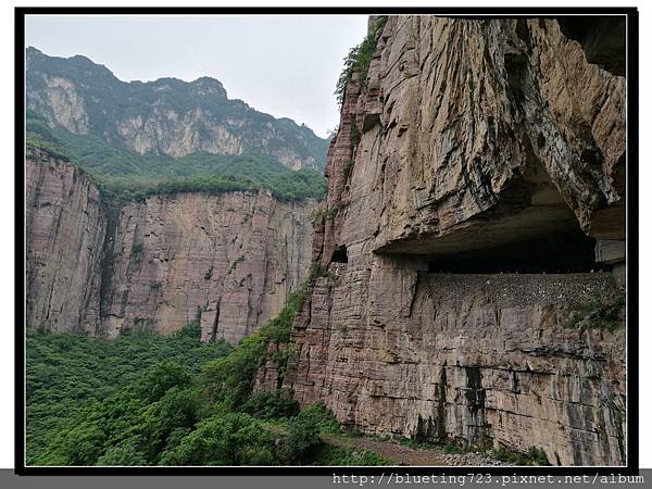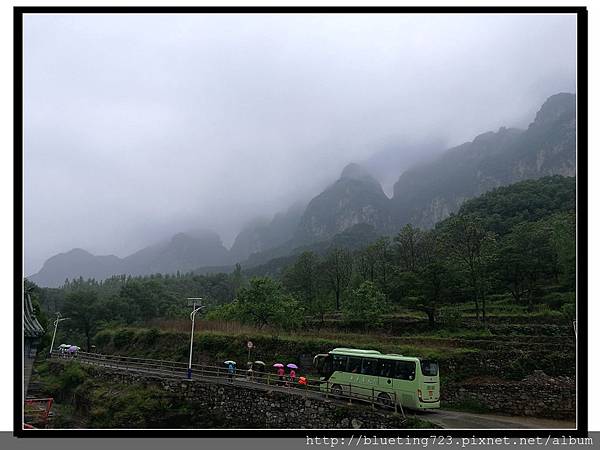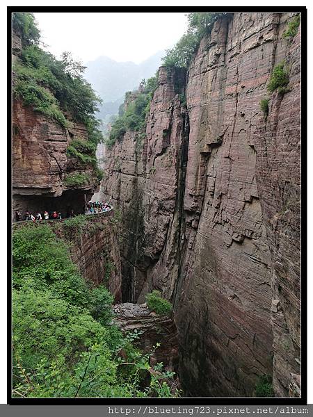 如果不是跟我們一樣走小路到「絕壁長廊」的朋友,就是從大門口搭乘往郭亮方向的景區交通車。出發前查網路資訊,說絕壁長廊沒有停站點,不過我在現場有看到距離絕壁長廊上行入口約300公尺有一個站點,但往郭亮的交通車都不停,所以不確定設點的原因,是否有特定車輛才會停。多數的團客都是搭到郭亮村之後往下參觀絕壁長廊。所以我們往上走的方向跟多數的團客相反,好處就是我們只需要走一趟下往上的路,如果是從郭亮村方向來,返程還需要走回郭亮村,就是上下來回一趟。