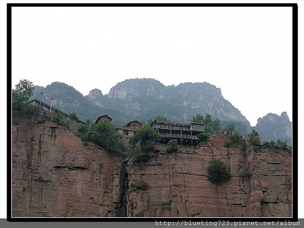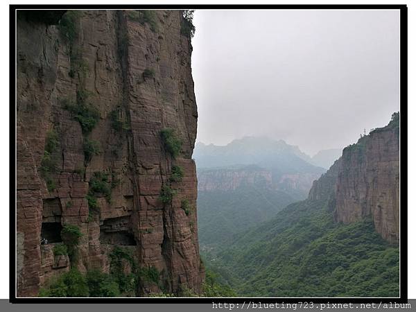郭亮村幾乎是匆匆進去繞一圈就走,再依據指示牌往「崖上人家」前進。崖上人家顧名思義就是住在懸崖上的人家,從絕壁長廊抬頭望去就能看到,的的確確是在懸崖上的人家。不知道大家有沒有注意到照片,房屋底下有一條水流,我不確定那是泉水還是住家廢水,如果是住家廢水那也太……驚奇了。