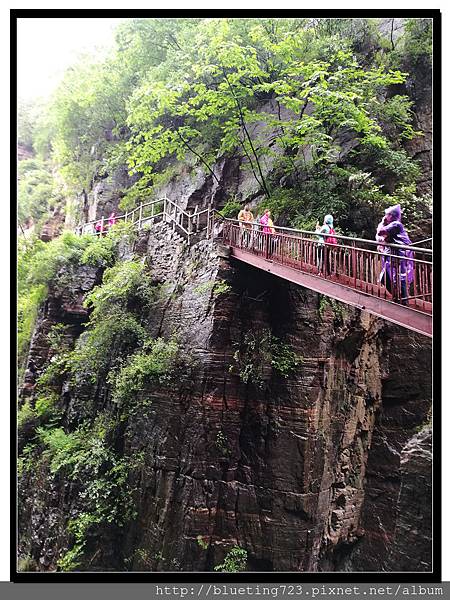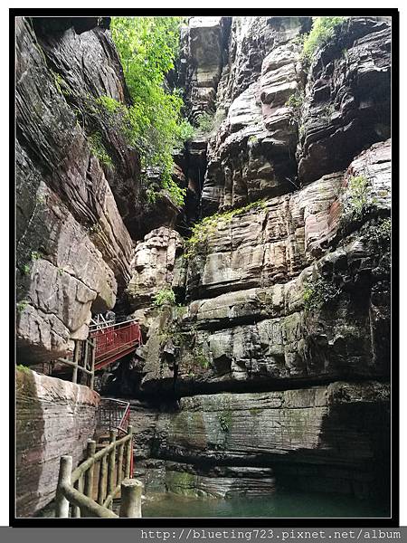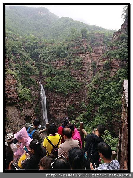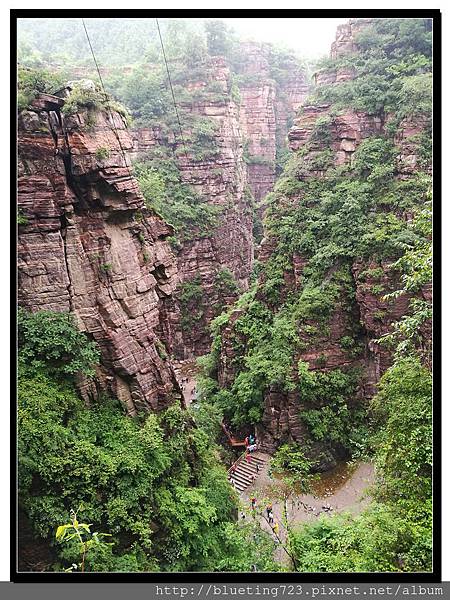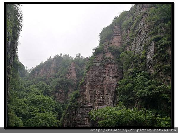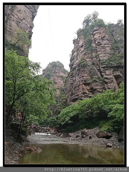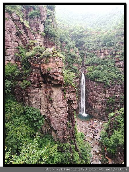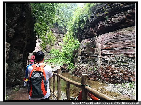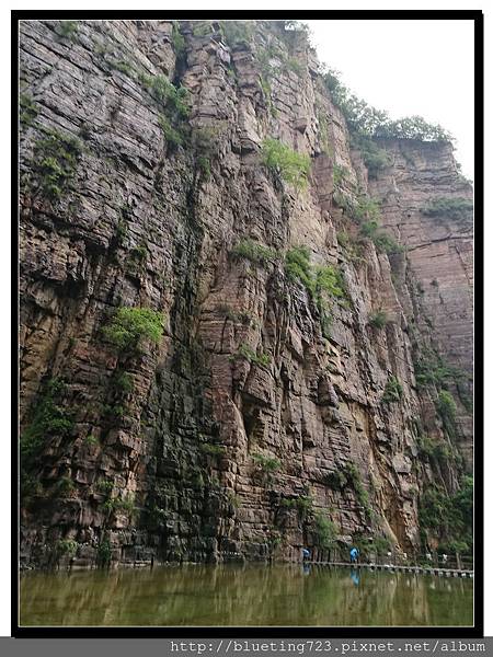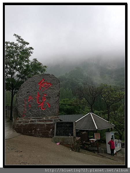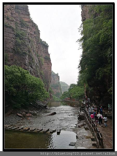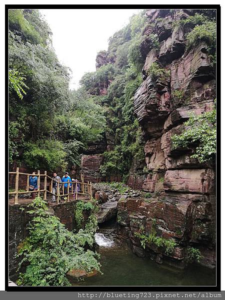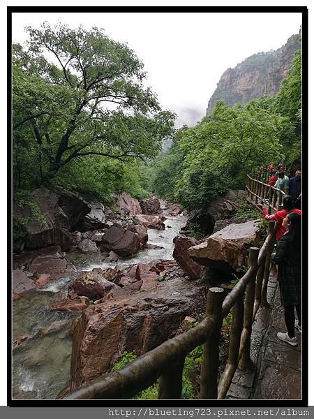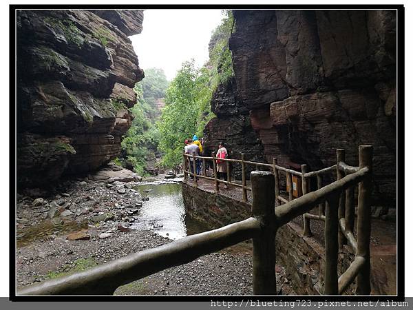 從丹分溝的入口處下車,順指標一路向下,一路上只有一條通道與棧道,順行而下即可。丹分溝屬於南太行山秀美山水的精華,被譽為「紅峽碧水江南,飛瀑奇潭仙境!」。相傳是太上老君修煉、分丹之仙境,不過中國各處旅遊名勝皆有許多這類的傳說,聽聽就好。