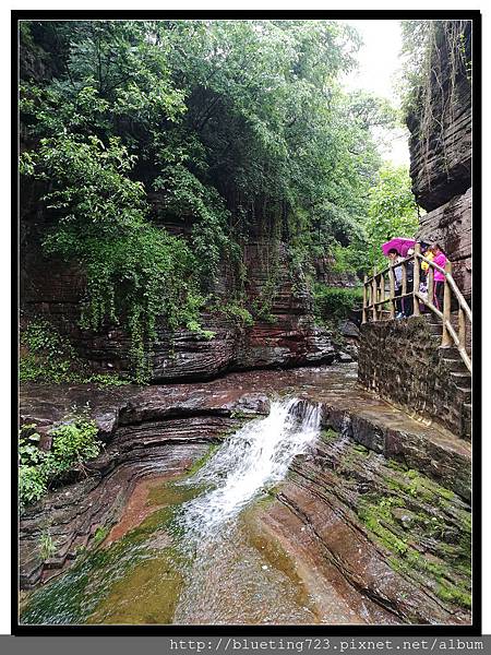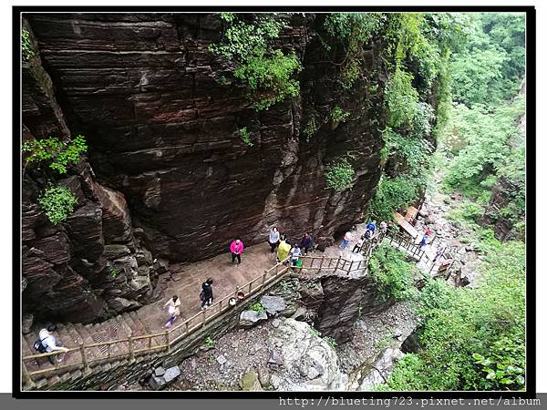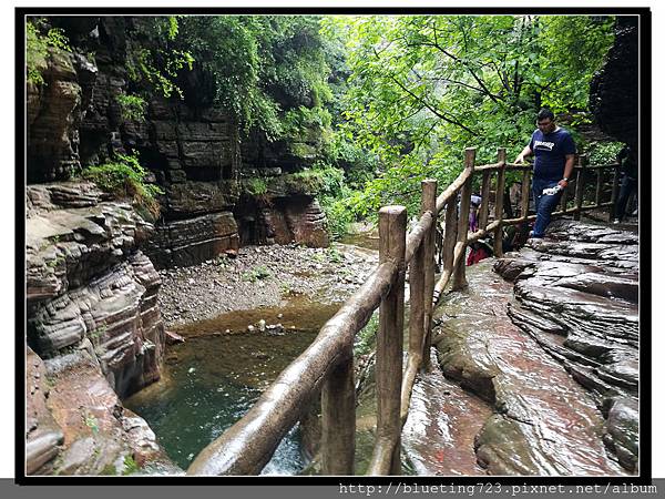 日月星石對面山壁就是「將軍峰」,沿右側的石階一步一步往上爬,約一小時左右可以抵達「龍潭溝」參觀黑龍潭瀑布,但距離丹分溝還有段路,而且沿路是往上的山路。當天預計下午一點離開萬仙山往機場,而我們抵達日月星石已經是上午九點半左右。當然是用另一方案,從日月星石搭私家車到山頂的丹分溝入口,從丹分溝開始沿路往下到龍潭溝,最後回到日月星石,這個路線慢慢走大約兩小時可以回到南坪景區。