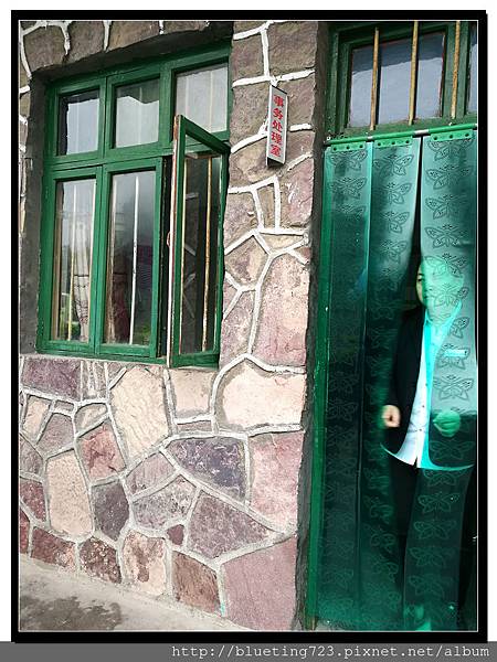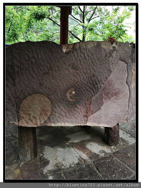 往前走沒多遠,看到一堆人聚集在一個涼亭下,靠近一看,原來是「日月星石」,招呼爸媽跟伯父伯母瞧一瞧。日月星石是一塊淡粉色的砂岩,石面長2.28 米,最寬處1.28 米,最厚處1.07 米。1995 年,是村民鑿石蓋房發現的,見石板面上顯著太陽、月亮、星星的圖像,日月星石上的太陽似朝陽初升,直徑33 公分,乳白色;右上方19 公分處是一彎新月,月牙徑長16 公分,56 粒晶體狀的石英石像星星一樣均勻地鑲嵌在太陽和月牙地周圍。據說曾經有人開價十萬購買,但村民覺得這是鎮山瑰寶不能販售,所以現在成為一個參觀景點。