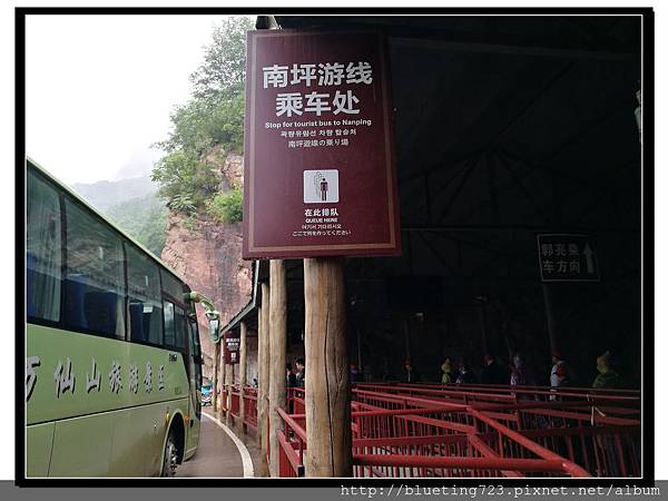事務處理室的姑娘確認我們五人都有照片證明後,再把我們手上的票卡過機器確認是否有效,之後將我們帶往驗票口,開了工作人員通道讓我們進入。進入景區大門後,前方就是交通車搭乘處,有通往不同路線的乘車點,我們當天的計畫是要到丹分溝遊玩,所以排了往南坪的車。